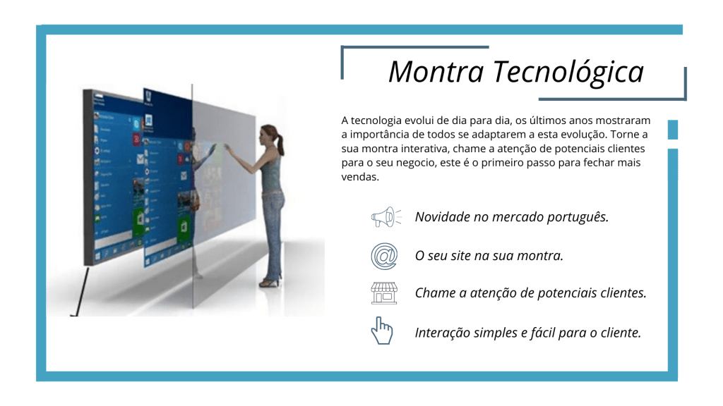 A tecnologia evolui de dia para dia, os últimos anos mostraram a importância de todos se adaptarem a esta evolução. Torne a sua montra interativa, chame a atenção de potenciais clientes para o seu negocio, este é o primeiro passo para fechar mais vendas.