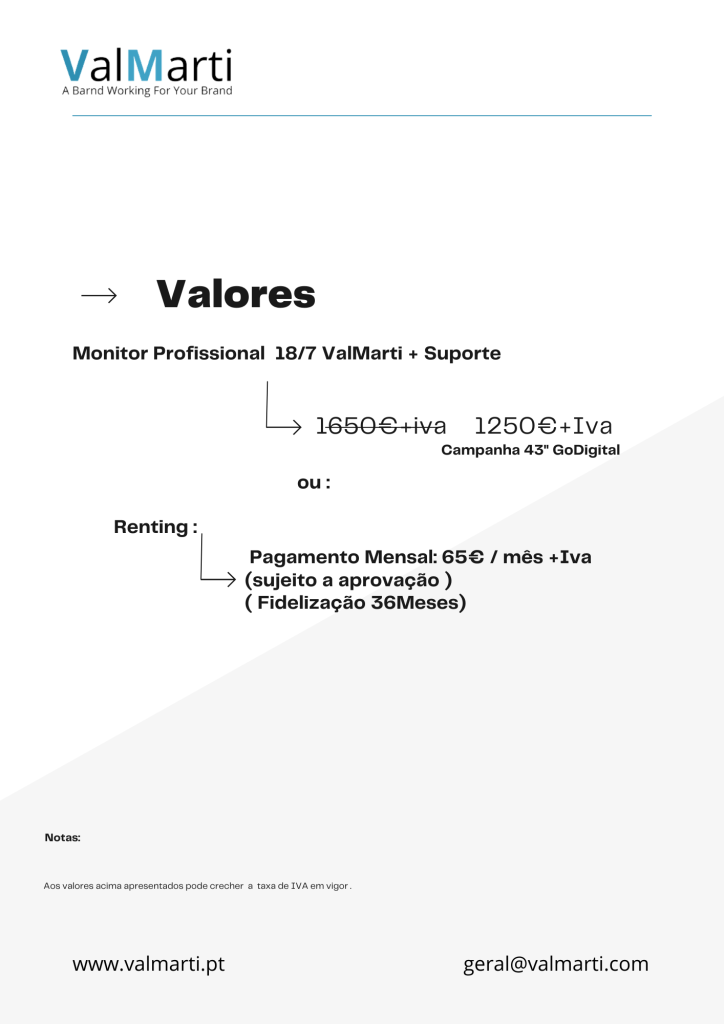 Campanha CoDigital Valmarti 1.1 Limitado ao Stock Existente: Stock Atual: 2 Uni Fazer Pedido: ← BackYour message has been sent Nome(obrigatório) Atenção Email(obrigatório) Atenção Contacto Telefónico (obrigatório) Atenção NIF( número de contribuinte )(obrigatório) Atenção Tipo de Pagamento(obrigatório) Renting ( Sujeito a aprovação) Pronto Pagamento( Pago no ato da entrega ) Atenção Outras Informações Atenção Aviso! ReservarSubmitting form Δ