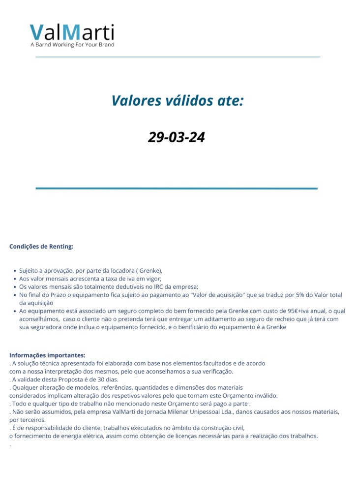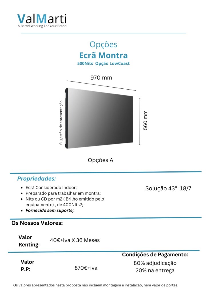 Proposta Ecrã Profissional 43″ 400 Nits Dados Para encomenda: Nota de Encomenda ← BackYour message has been sent Nome Fiscal Empresa(obrigatório) Atenção Nome comercial Atenção Nome do Responsável(obrigatório) Atenção NIF(obrigatório) Atenção Morada(obrigatório) Atenção Contacto(obrigatório) Atenção Email(obrigatório) Atenção Opção de Aquisição com P.P .?(obrigatório) Só Ecrã Valor: 870€+iva Ecrã + Suporte Valor : 1060€+iva Atenção Condições de Pagamento de Pronto Pagamento: 70% Adjudicação 30% Entrega Opção de Aquisição com Renting .?(obrigatório) Só Ecrã Valor: 40€+iva X 36M ( sujeito a aprovação) Ecrã + Suporte Valor : 1060€+iva X 36 M ( sujeito a aprovação) Atenção Notas: Atenção Aviso! EncomendarSubmitting form Δ